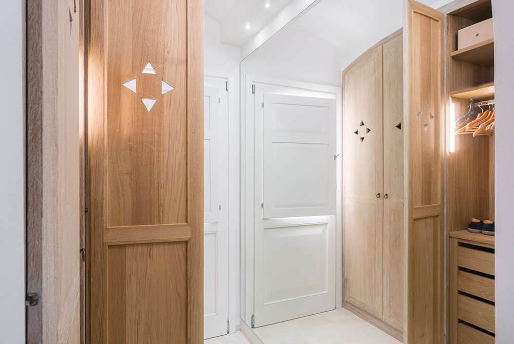 Im Obergeschoss befinden sich ein helles Wohnzimmer mit Kamin, eine offene Küche mit großem Esstisch sowie ein Gästebad. Außerdem gibt es ein Hauptschlafzimmer mit eigenem Bad und begehbarem Kleiderschrank sowie ein zweites Doppelzimmer mit eigenem Bad.