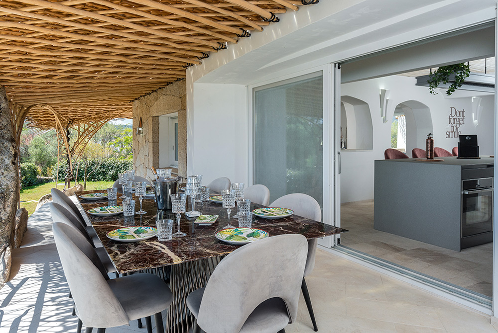 Villa Cucu - der Esstisch auf der überdachten Terrasse mit Blick durch die Terrassentür auf die Kochinsel in der gut ausgestatteten Küche