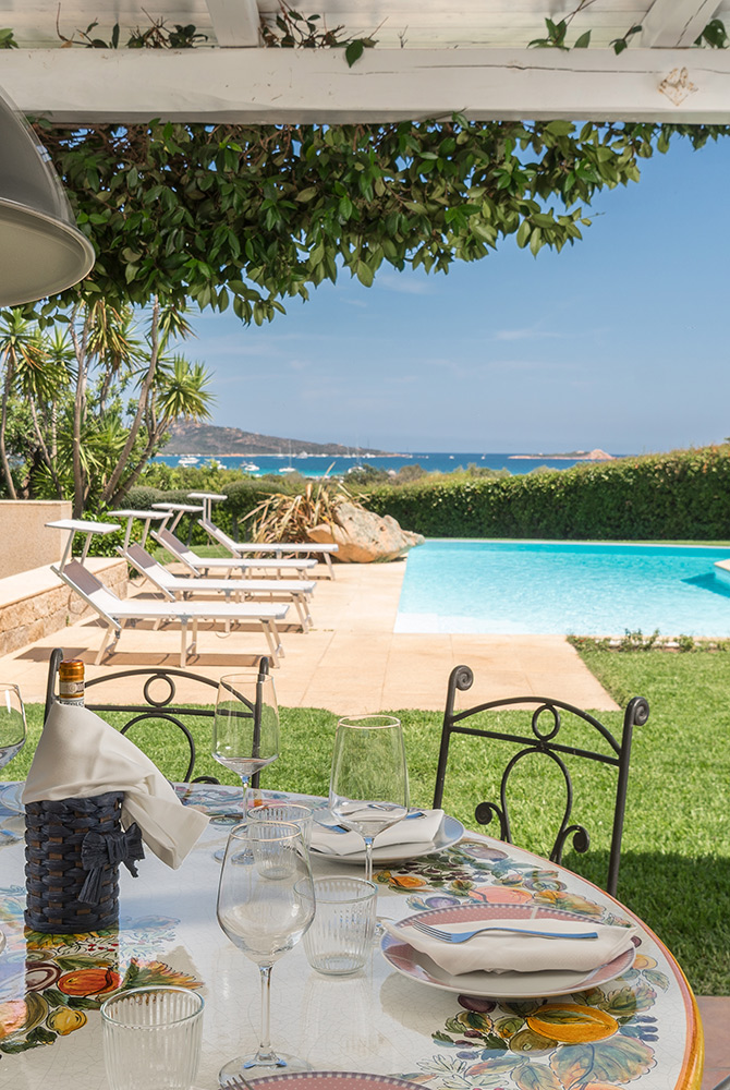 Villa Mira - Die große überdachte Außenterrasse des Haupthauses ist mit einer bequemen Sitzecke und einem Esstisch ausgestattet und bietet einen herrlichen Blick auf den Garten, den privaten Pool und die unverwechselbaren Farben des Strandes Lu Impostu.