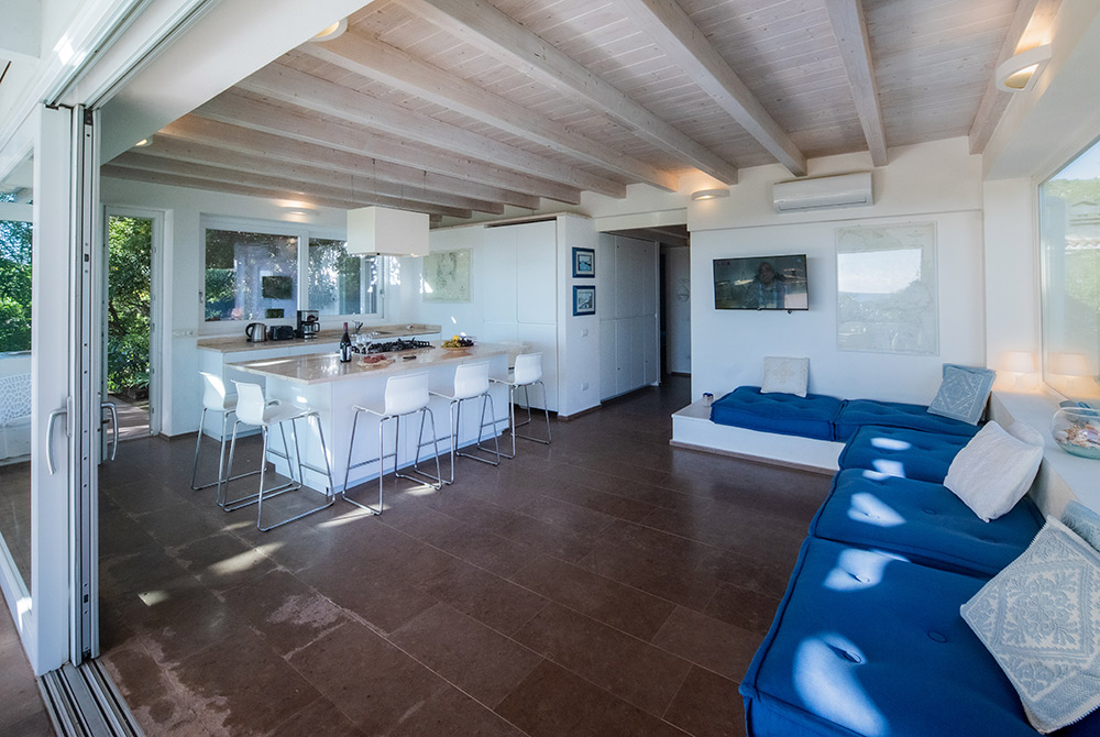 Von der Strandseite der Villa gelangt man auf die Terrasse und von dort in das große, offene Wohnzimmer mit Kochinsel und großzügigen Sitzgelegenheiten.
