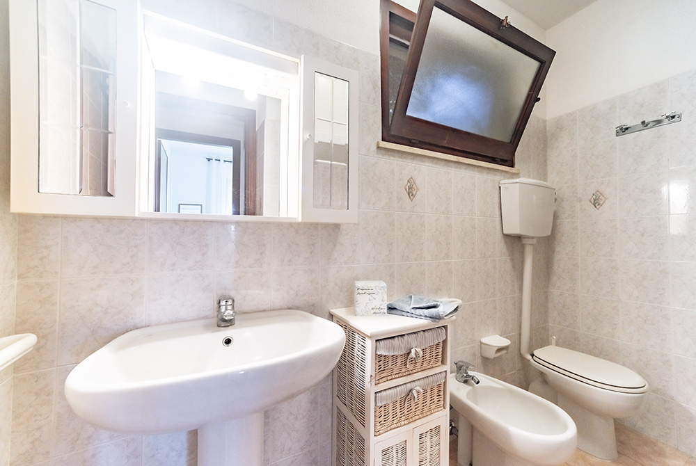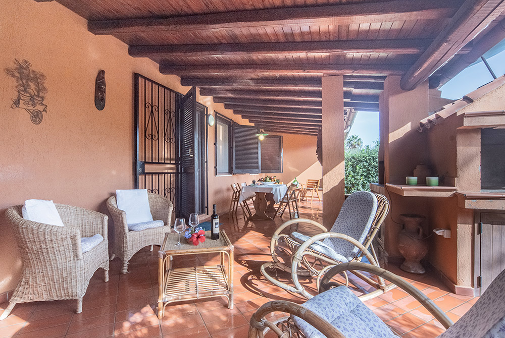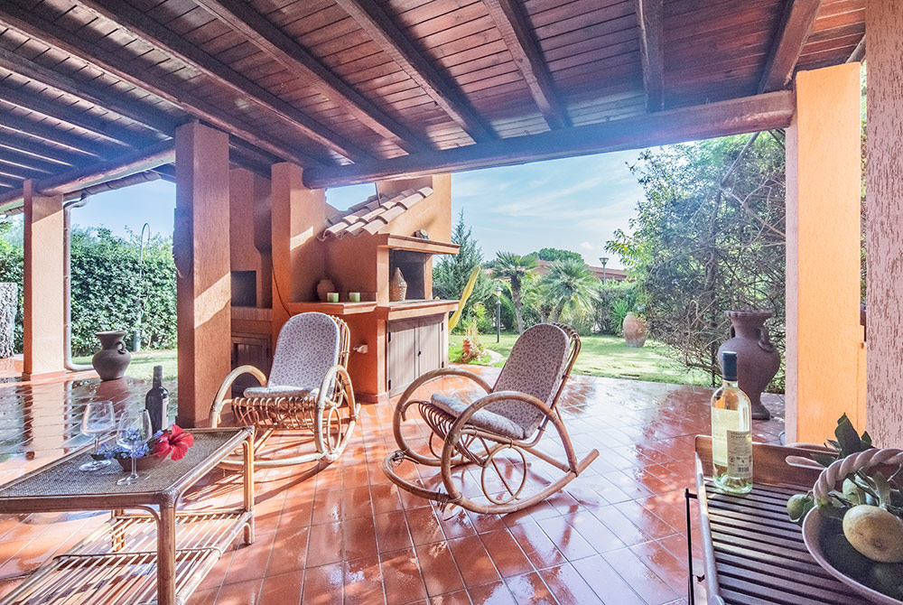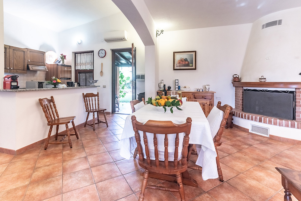 Die Villa bietet drei Schlafzimmer, zwei Bäder, einen großen, Soggiorno mit sehr gut ausgestatteter Küchenzeile mit Spülmaschine und Kamin sowie einen gemauerten Barbecue auf der großen, überdachten Terrasse. Fußweg zum Strand: ca 145 m