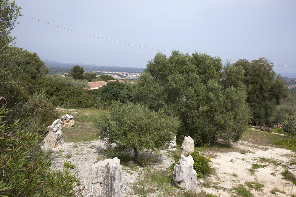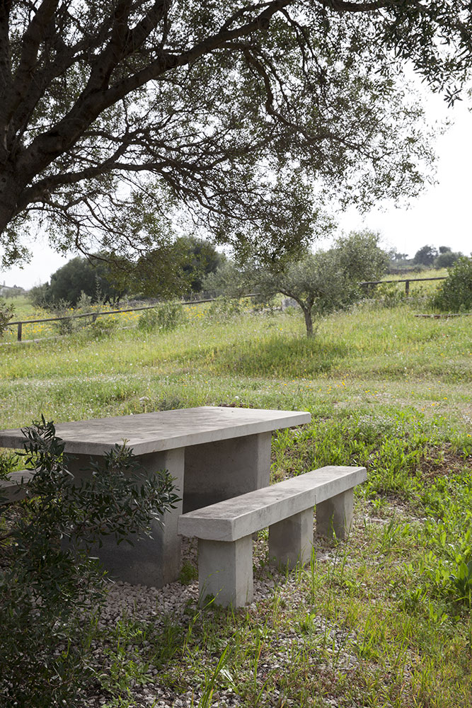 riesiger Garten mit steinernem Esstisch unterm Olivenbaum,