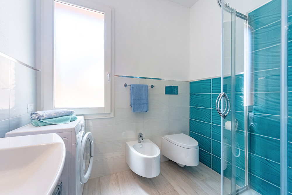 Bad mit Dusche, WC, Waschbecken und Waschmaschine