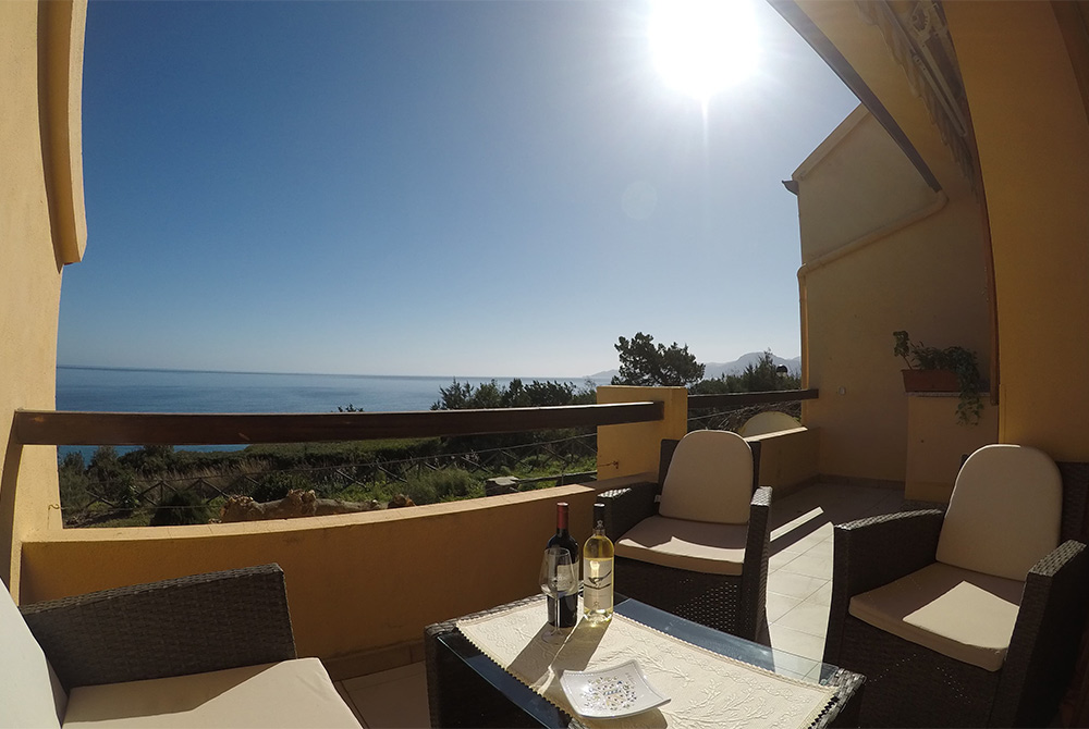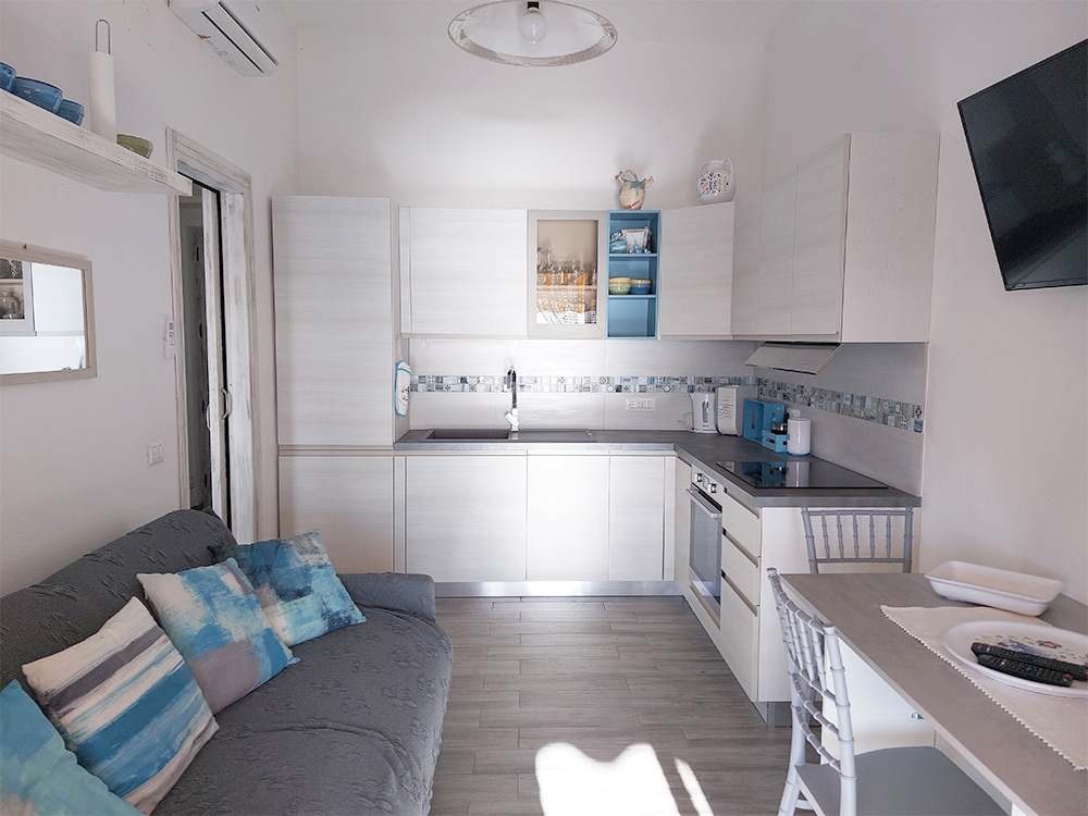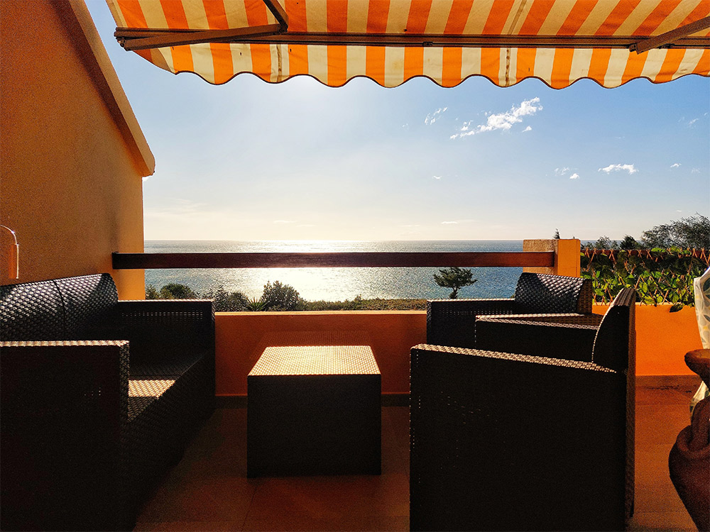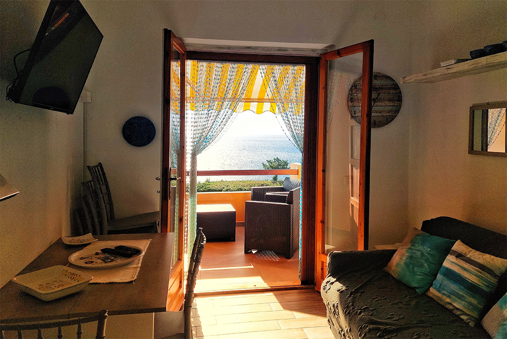 Casa Arborinu - die Wohnküche mit Ausgang zur Terrasse und Meerblick