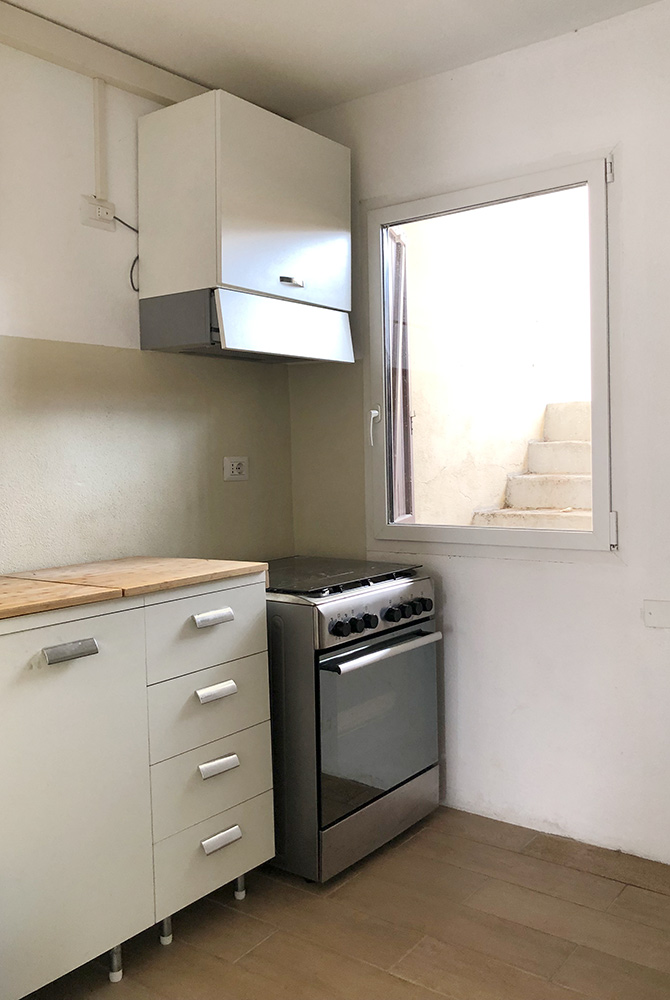 Vom hier gelangt man in eine kleine, aber funktionale Stehküche und ein weiteres Badezimmer mit Dusche, WC und Waschbecken.