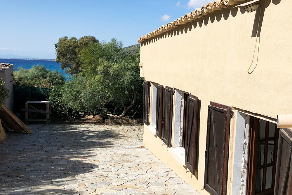 Villa Arrosa - Am Ende des Hofes, zur linken Seite hin, lädt ein kleiner, runder Pool mit komfortablen Sonnenliegen und einer praktischen Außendusche zu entspannten Momenten ein. Von hier genießt man einen bezaubernden Blick auf das glitzernde, türkisblaue Meer. Der mit Natursteinen geflieste Hof bietet viel Platz.