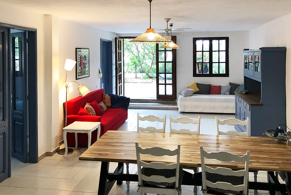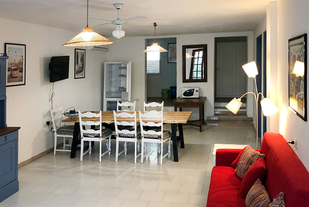 Der Eingang des Hauses befindet sich hinten, auf der zum Meer hin zugewandten Hausseite. Im Inneren führt der Weg direkt in das einfach, aber stilvoll gestaltete Wohn-/Esszimmer, ausgestattet mit einem Schlafsofa und einem Einzelbett samt ausziehbarem zweiten Bett, einem einladenden Holzesstisch und einem Fernseher. Platzbedingt sind hier auch Kühlschrank und Mikrowelle untergebracht.