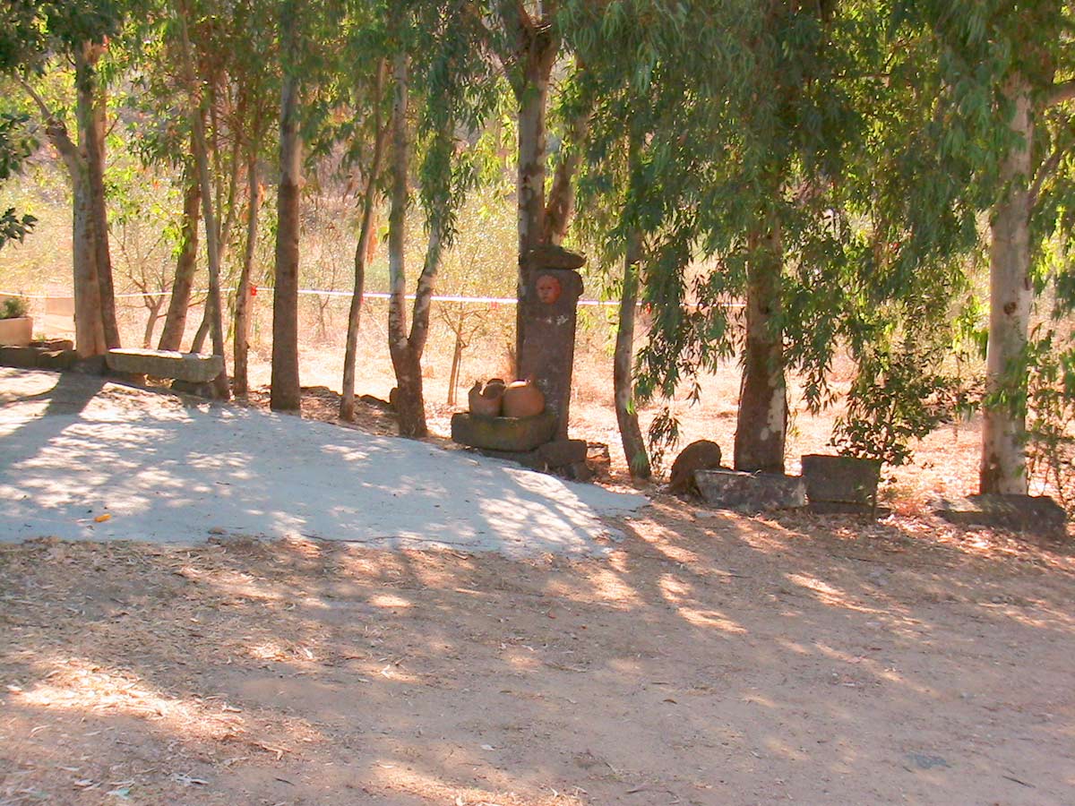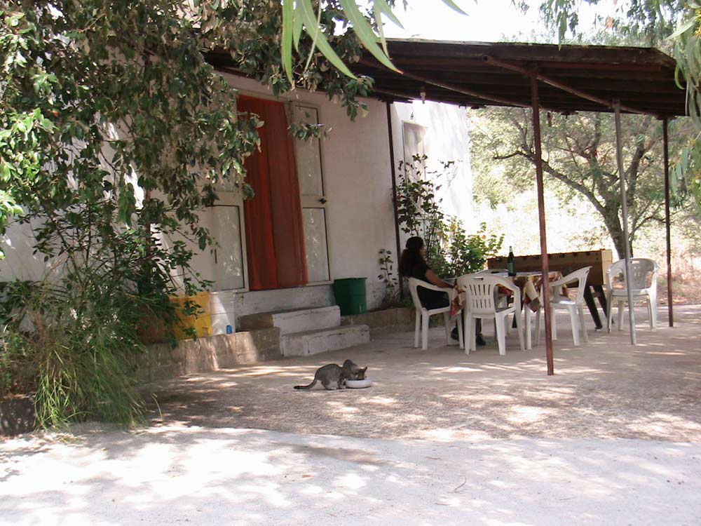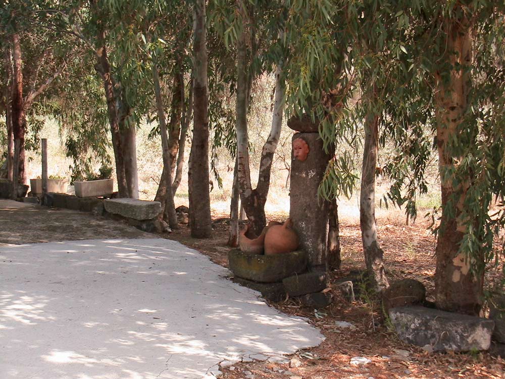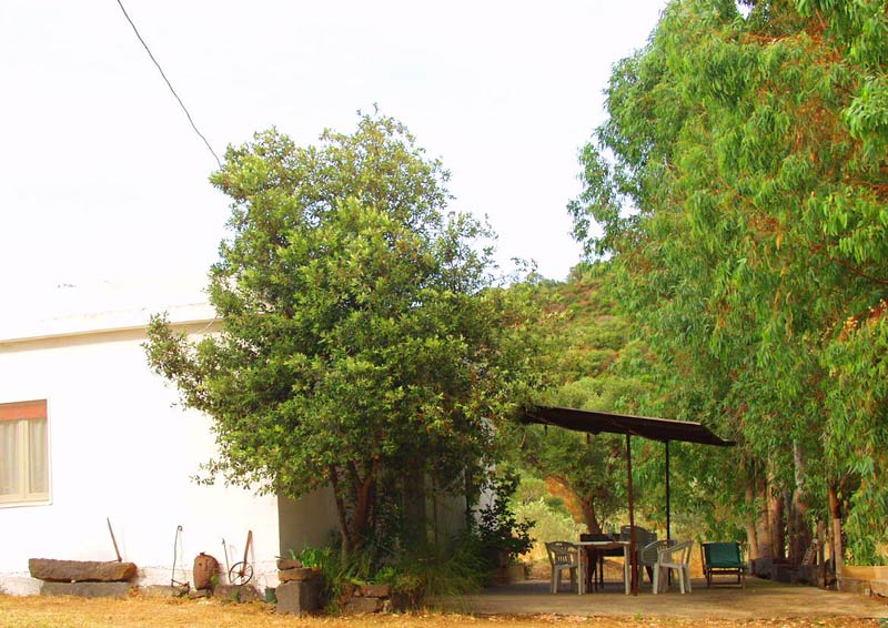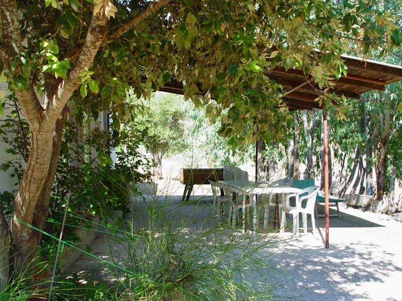 unter riesigen Feigenbäumen. Wein wächst am Haus.