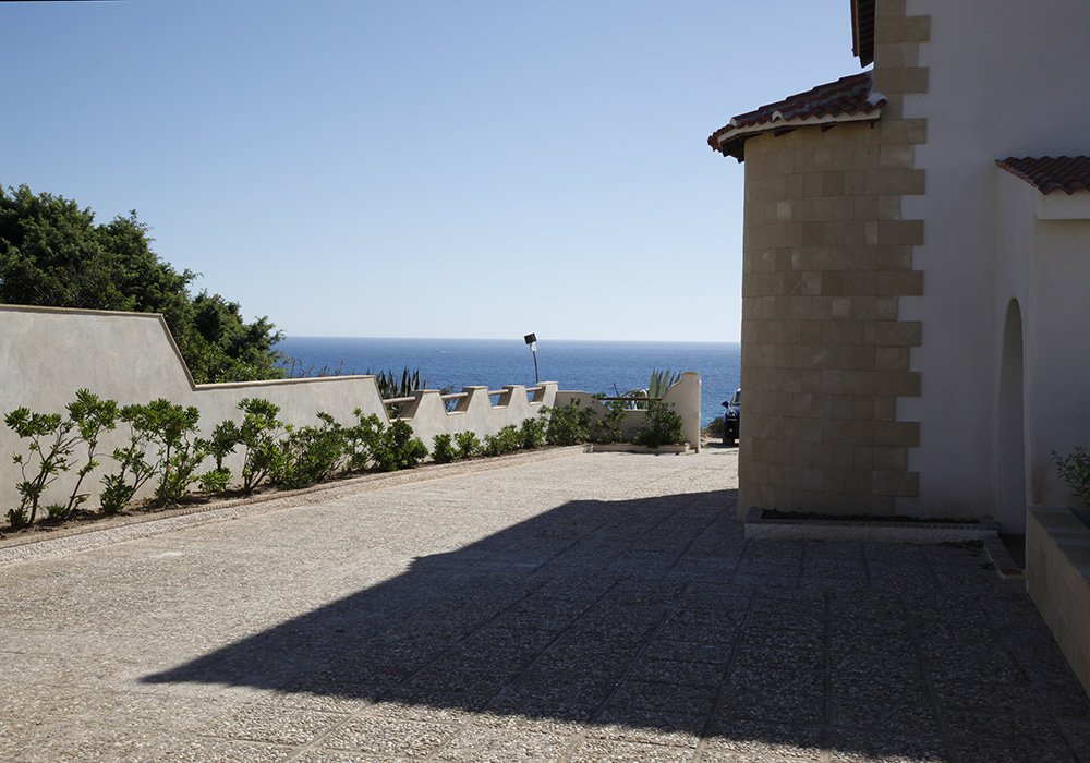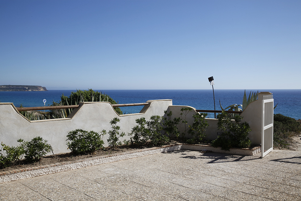 Balena, die überdachte Terrasse mit Blick über den gepflasterten Freisitz und die mediterrane Macchia aufs Meer