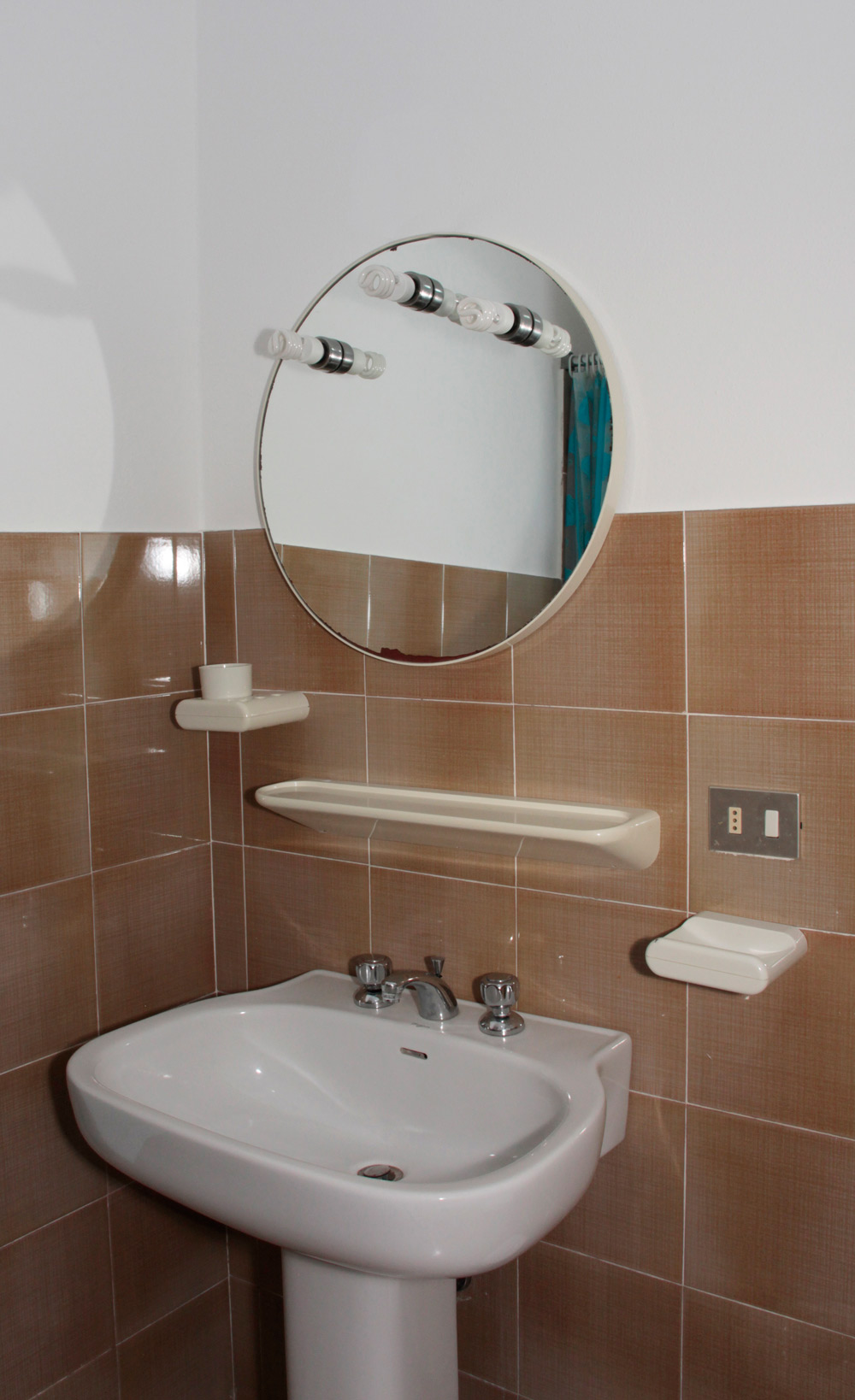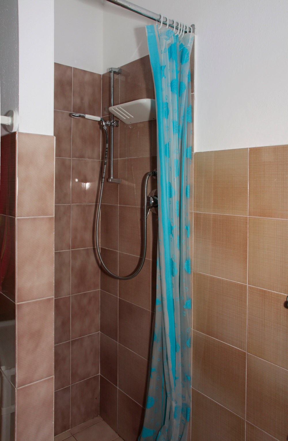 Das Bad mit Dusche, Waschbecken, Bidet, Toilette.