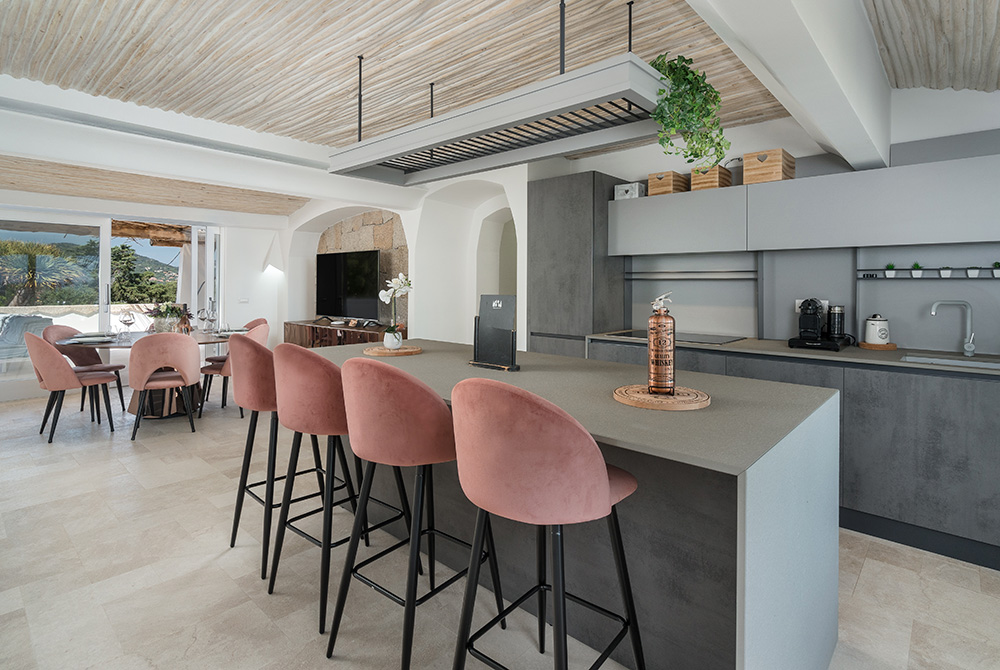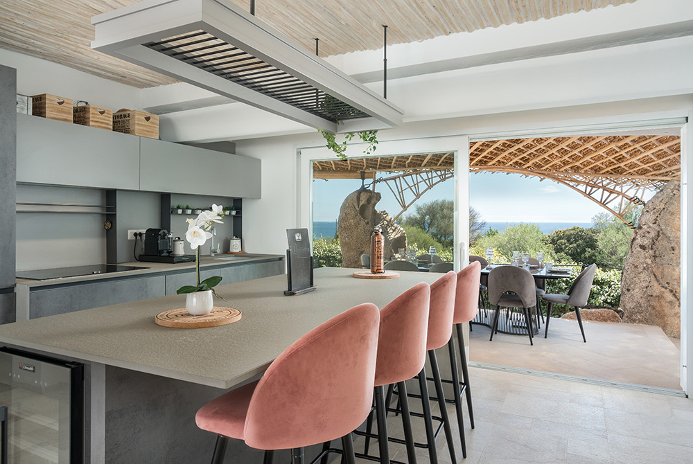 Villa Cucu - hier wird das Kochen zum gemeinschaftlichen Erlebnis mit Blick zu beiden Terrassen und im Hintergrund - das Meer