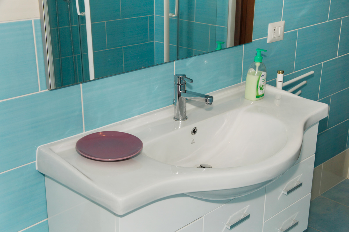 der Waschtisch mit Unterschrank, Mischbatterie und großem Spiegel