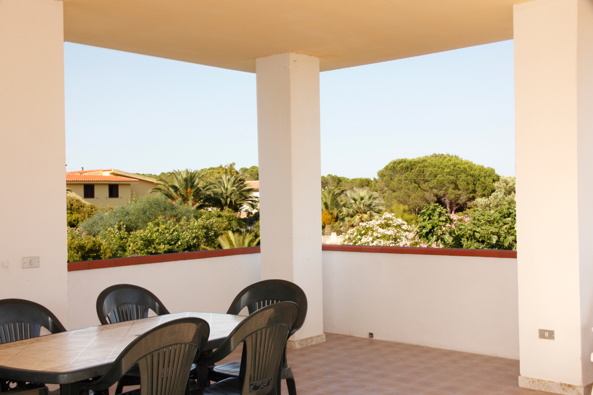 auf der überdachten, großen Terrasse haben Sie einen Blick in die umliegenden Gärten mit Oleander, Mirto, Zitrusbäumen, Pinien etc.