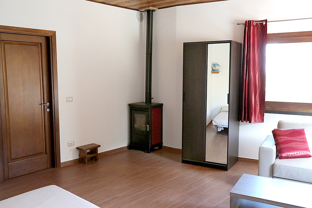 Casa Elike - das Wohnzimmer mit zwei Panoramafenstern und Kaminofen