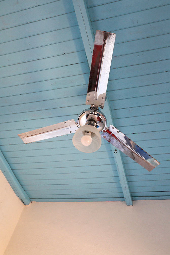 Casa Ghelea - der Ventilator im Schafzimmer vor himmelblauer Balkendecke