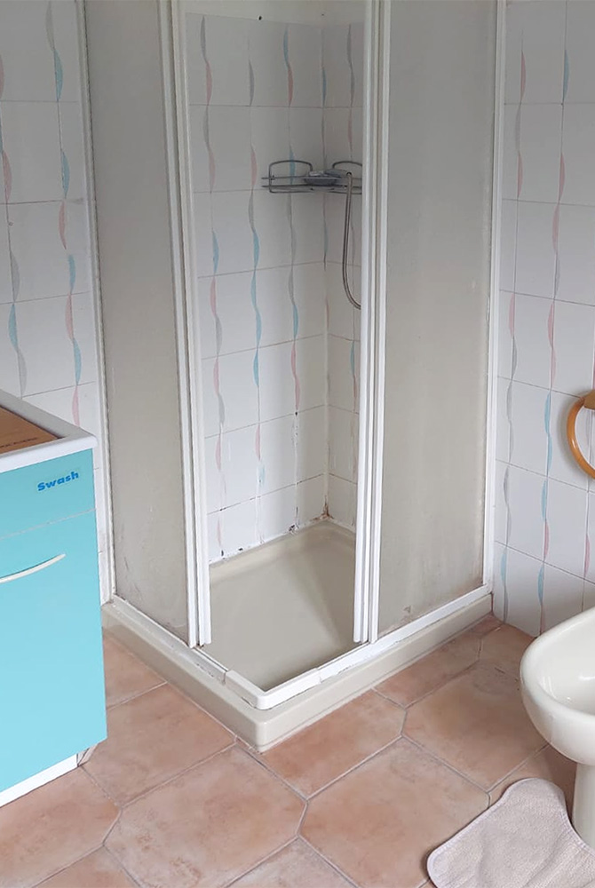 1 Badezimmer mit Vollausstattung: Dusche, Waschbecken, Toilette,
