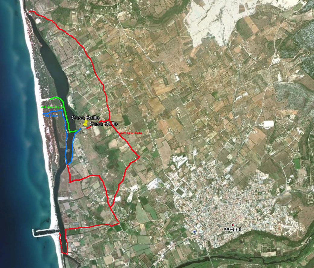 beträgt 3000 m. Die Luftlinie ist sehr viel kürzer, aber Sie müssen um den Rio Cedrino herumfahren, um den Strand zu erreichen.