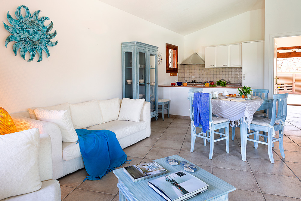 Villa Istedda - das große Wohnzimmer mit offener Küche. Außerdem gibt es ein Doppelschlafzimmer mit direktem Zugang zur überdachten Veranda und eigenem Bad, ein Doppelschlafzimmer mit eigenem Bad und ein Doppelschlafzimmer mit Zugang zur Veranda und dem dritten Bad.