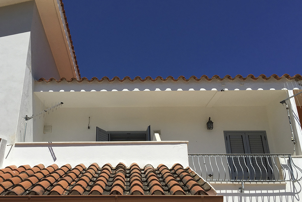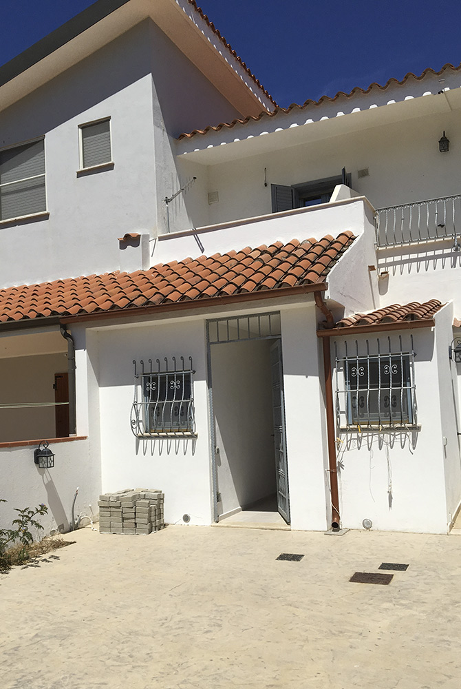 Casa Katalina - Eingang von Westen aus. Im von einer Mauer umgebenen Hof befinden sich ein riesiger Barbecue und ein Stellplatz für ein Auto. Oben der Balkon zu einem der beiden Schlafzimmer