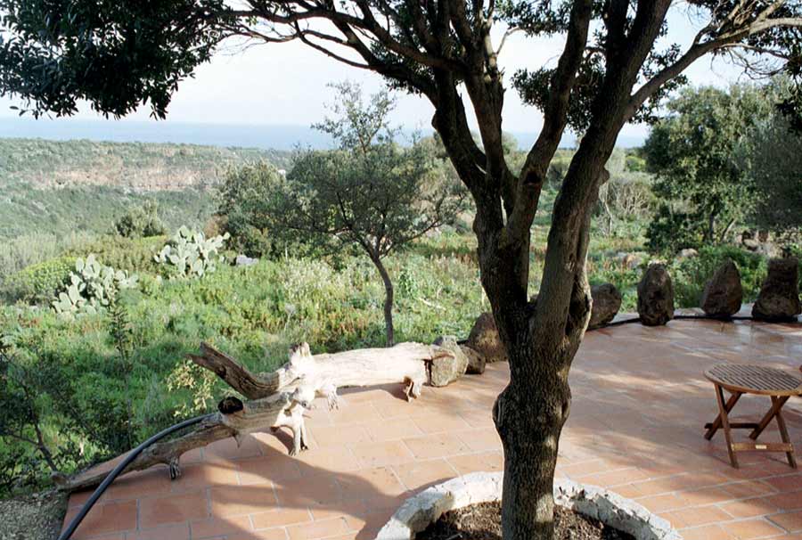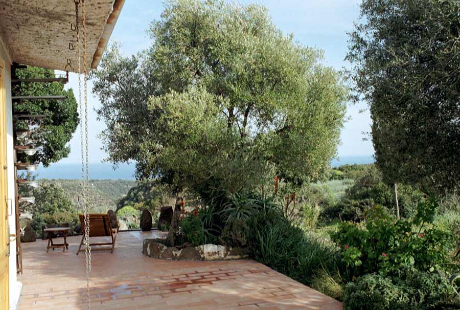 Terrasse mit Garten über das Tal und dahinter das Meer: