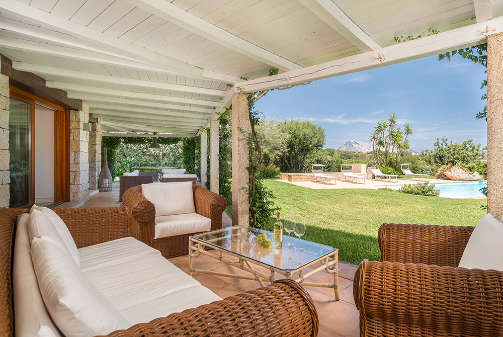 Villa Mira - Die große überdachte Außenterrasse des Haupthauses ist mit einer bequemen Sitzecke und einem Esstisch ausgestattet und bietet einen herrlichen Blick auf den Garten, den privaten Pool und die unverwechselbaren Farben des Strandes Lu Impostu.