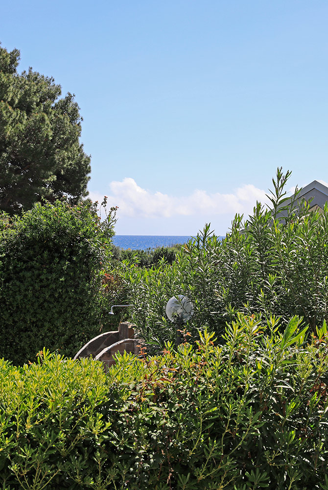 Villa Moru - die überdachte Terrasse bietet einen kleinen Meerblick durch die umliegenden Gärten