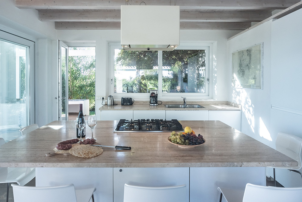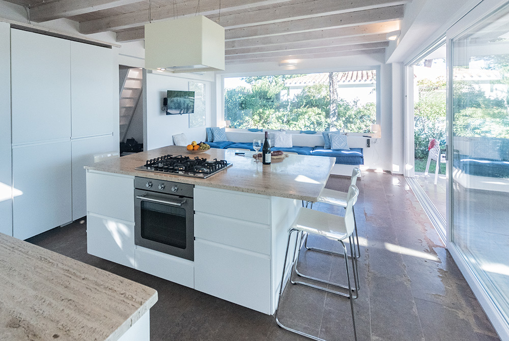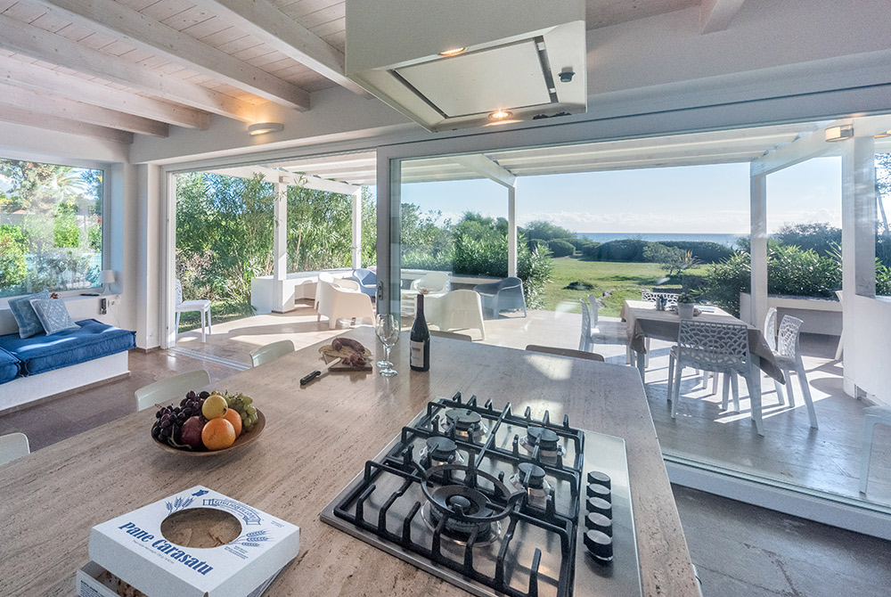 Von der Strandseite der Villa gelangt man auf die Terrasse und von dort in das große, offene Wohnzimmer mit Kochinsel und großzügigen Sitzgelegenheiten.