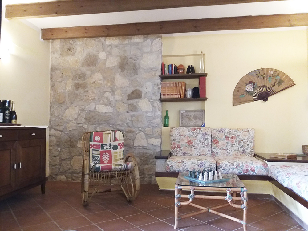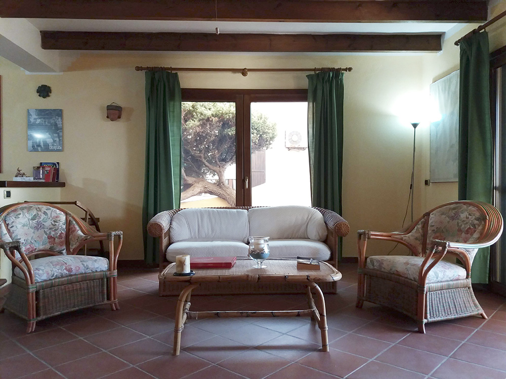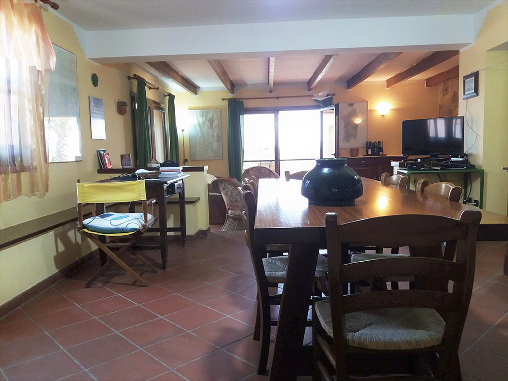 Casa Sa Rena - der Soggiorno mit TV, Ausgang zum Garten, Esstisch und diversen Sitzecken.
