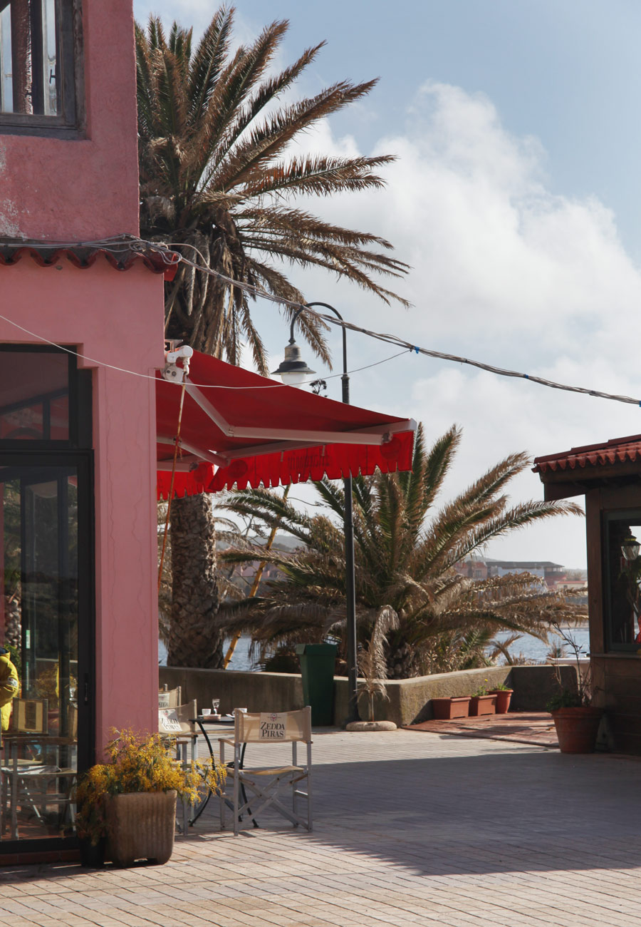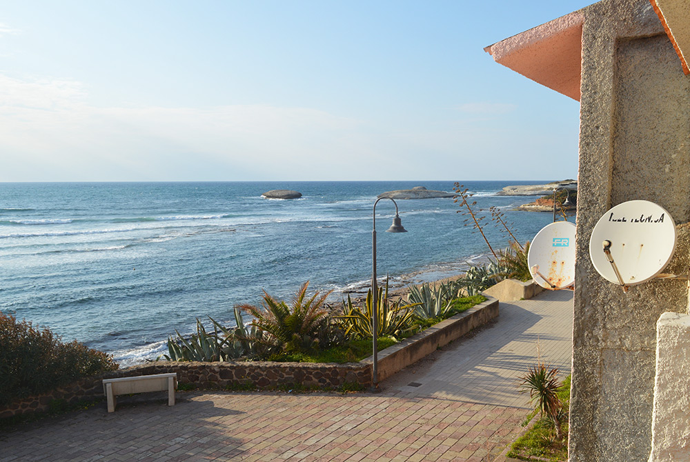 Der Blick vom Restaurant an der Strandpromenade in S'Archittu über den Strand. Dieses sympatische, kleine Örtchen