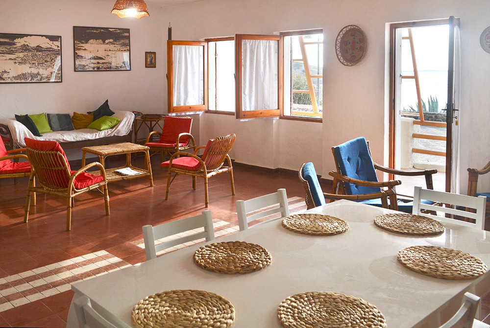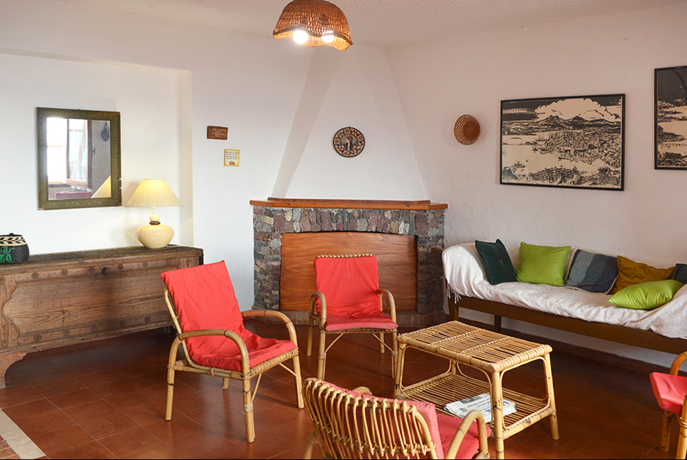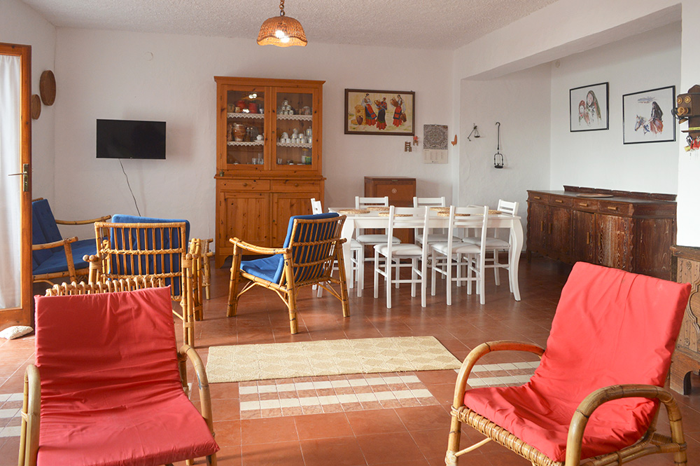 Casa Sussena - der Soggiorno mit roten Sesseln am Kamin, blauen Sesseln in der TV-Ecke und Esstisch
