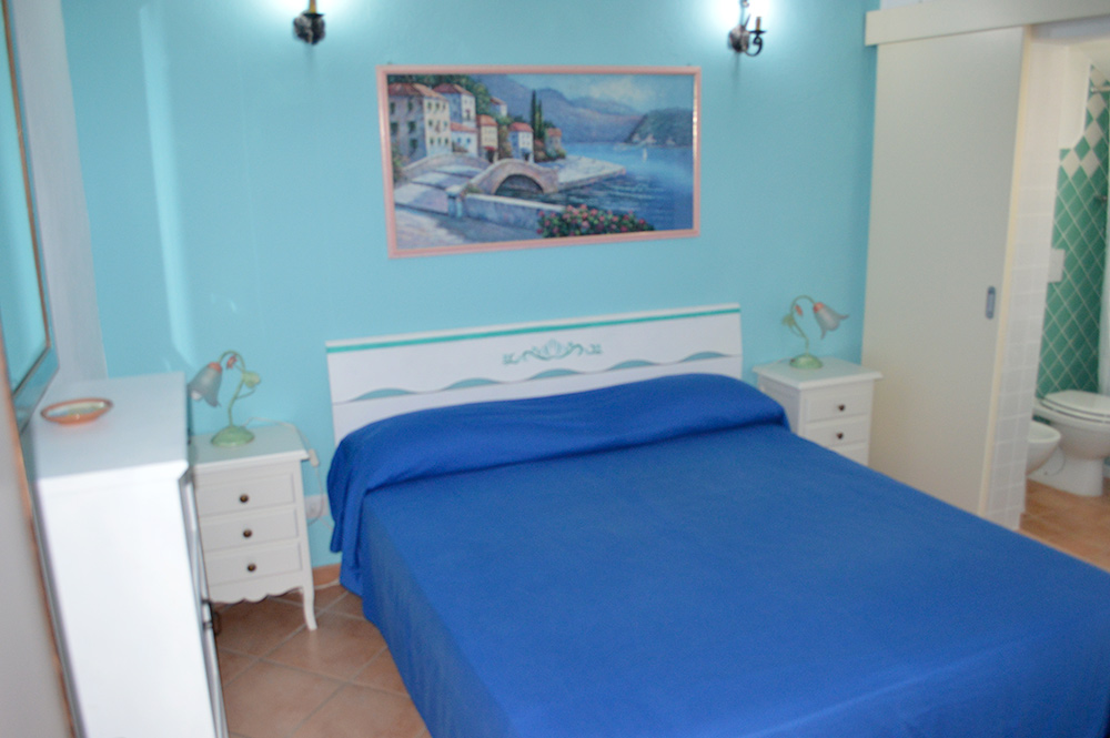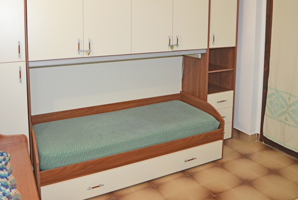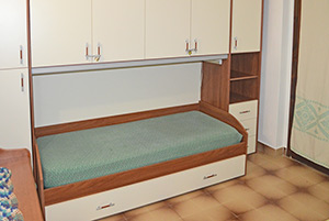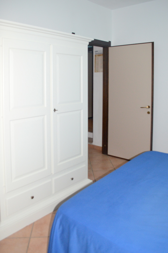 Das zweite und dritte Schlafzimmer, wie auch das zweite Bad, liegen ein paar Stufen oberhalb des Wohnbereichs. Ein Schlafzimmer verfügt über zwei zum Doppelbett zusammen gestellte Einzelbetten, das andere hingegen hat zwei separate Einzelbetten mit Hochschrank. Das Bad ist mit einer Duschkabine, WC, Bidet und Waschbecken ausgestattet und befindet sich genau zwischen diesen beiden Schlafzimmern.