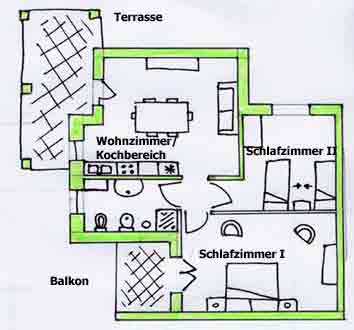 Geschlafen werden kann in zwei Schlafräumen (2-3 Betten